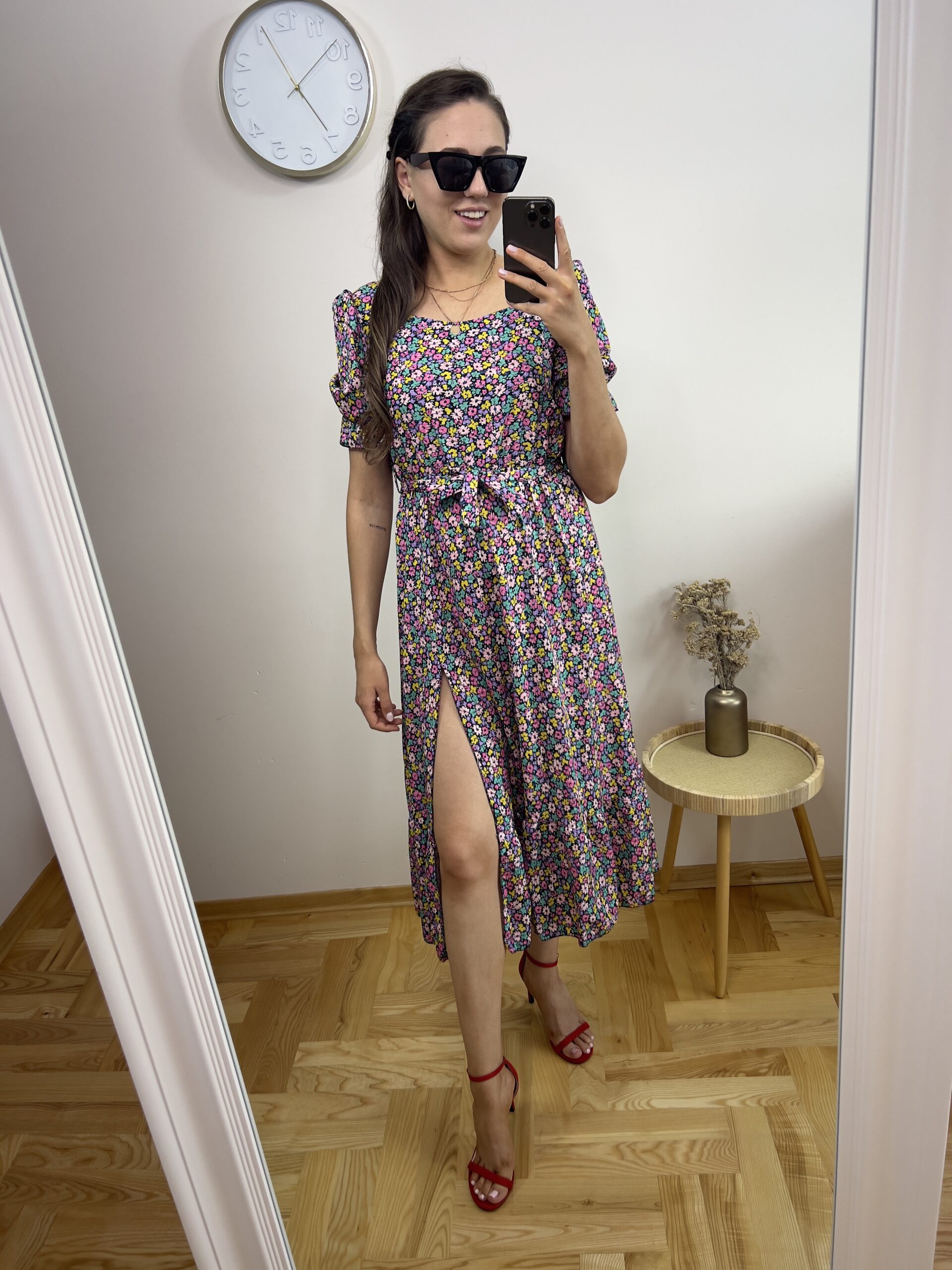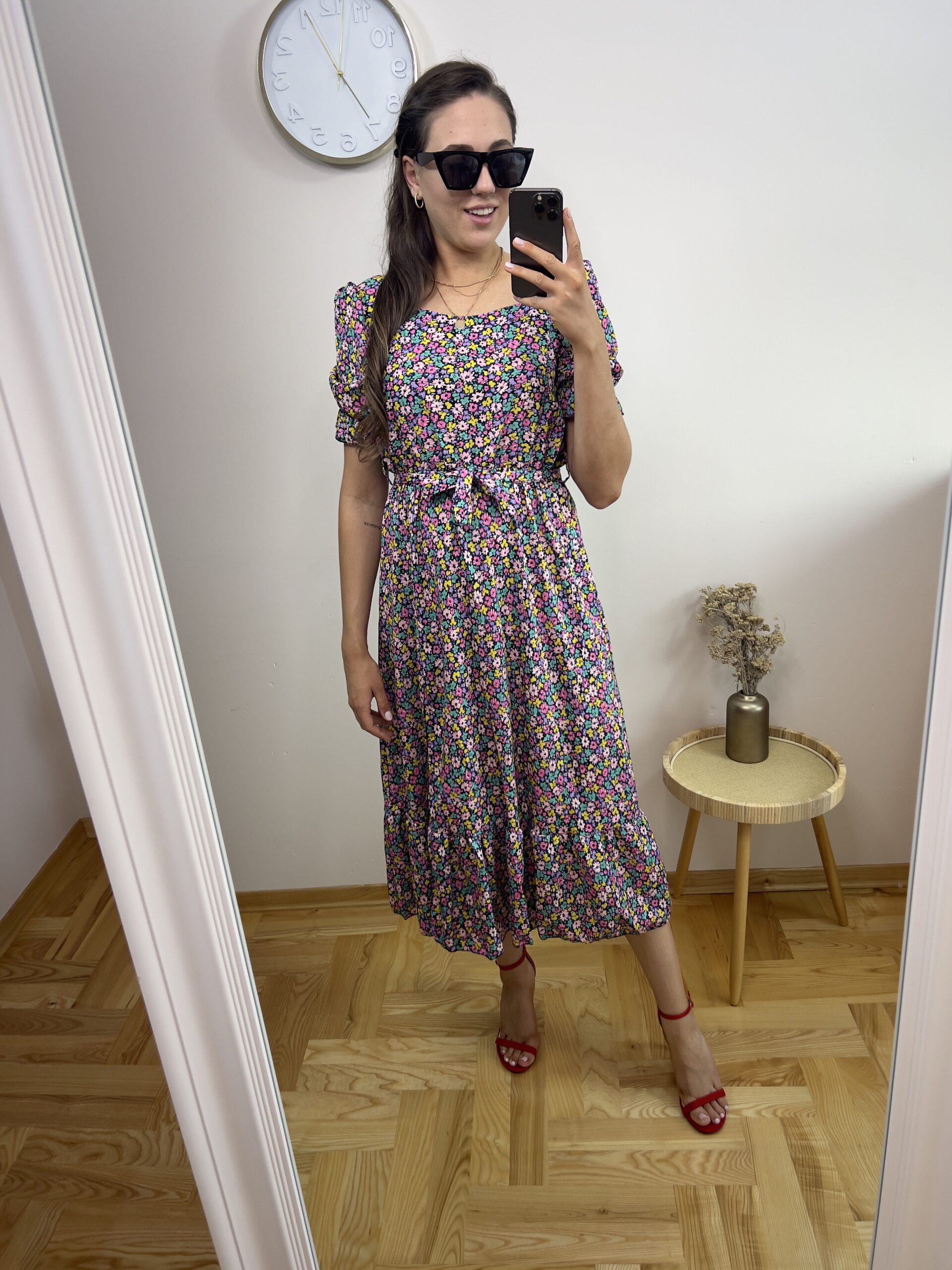 Ta sukienka to idealny wybór na letnie dni, łącząca w sobie wygodę i styl. Uszyta z lekkiego, przewiewnego materiału, sukienka ma długość midi, sięgającą do połowy łydki. Na całej powierzchni znajduje się uroczy, drobny kwiatowy wzór w odcieniach różu, fioletu, żółci i zieleni na czarnym tle, co dodaje jej romantycznego charakteru. Sukienka posiada kwadratowy dekolt oraz krótkie rękawy z delikatnym marszczeniem, które dodaje objętości i stylowego wyglądu. W talii znajduje się wiązanie, które podkreśla kobiecą sylwetkę. Modelka na zdjęciu zestawiła sukienkę z czerwonymi sandałami na obcasie, które doskonale komponują się z kolorystyką sukienki. To idealna propozycja zarówno na codzienne wyjścia, jak i na letnie spotkania ze znajomymi.
